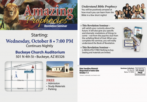 Mark your calendars for an exciting Revelation Seminar coming this October! The nightly programs will be streamed live each evening from Desert Cove Church, while our Sabbath worship services will continue in-house at our local church.